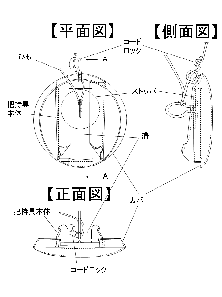 シャツ・ステイ把持具の平面図・正面図・側面図